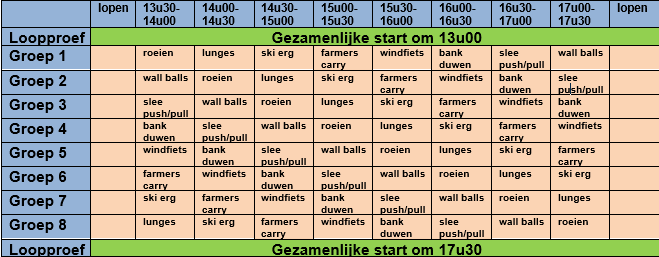We werken via een doorschuifsysteem.  De loopproef wordt gezamenlijk gestart. Voor de andere proeven worden de deelnemers opgedeeld in groepjes van 6. De ploegen schuiven door wanneer ze klaar zijn met hun proef. Er worden 25 minuten voorzien per proef en 5 minuten doorschuiftijd. De dag sluiten we opnieuw af met een loopproef.